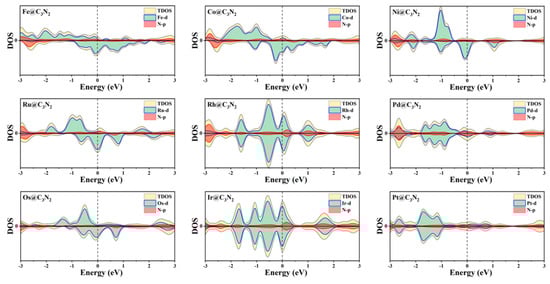 Subsequently, we investigated the geometric structures, stability and electronic properties of the doped pc-C3N2 systems, where the transition metal atoms in group VIII (TM = Fe, Co, Ni, Ru, Rh, Pd, Os, Ir and Pt) are used to embed into each large or small cavity (Figure 1c,d). For convenience, all these newly formed systems can be represented as TM@C3N2. After optimization, these TM@C3N2 systems can still maintain a planar structure with P4/MMM symmetry, where the TM atoms are located at the center of each hole, independent of the hole size. The calculated lattice parameters are in the range of 16.244~16.505 Å, which can be very close to that of the pristine pc-C3N2 (a = b = 16.580 Å), indicating a large structural rigidity. As shown in Table 1, the calculated TM-N bond lengths in the large cavity (2.294~2.409 Å) can be slightly longer than those in the small cavity (1.889~1.981 Å), but all of them can also be close to the corresponding TM-N bond length of experimentally obtained metal nitrides (1.830~2.300 Å). As a result, the TM atoms may be stably anchored in these cavities of the pc-C3N2 monolayer to form two different kinds of TMN4 units, which can be reflected by their large positive binding energies (Eb) in the range of 5.17~13.00 eV, as shown in Figure 1e. Besides, it has been widely accepted that a ratio of binding energy to cohesive energy (−Eb/Ec) greater than 0.5 indicates that single atoms tend to separate on the substrate rather than aggregate together [39,40,41]. For all of these TM@C3N2 systems, the calculated −Eb/Ec values can be greater than 0.5 (Table S1), and even most values are greater than 1, which means that TM atoms can be anchored at the holes individually rather than clustered together.