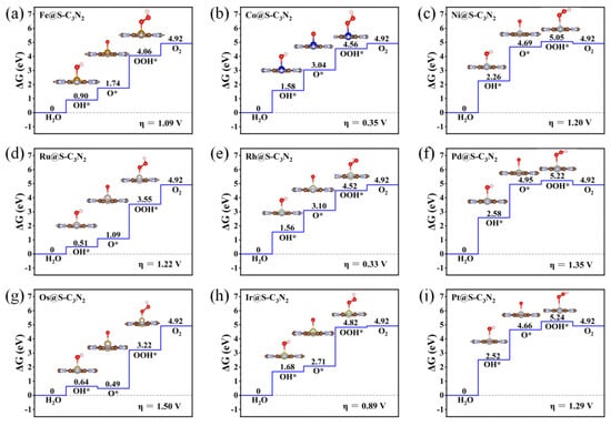 Gibbs free energy diagram of OER for the TM@S-C3N2 series including Fe@S-C3N2 (a), Co@S-C3N2 (b), Ni@S-C3N2 (c), Ru@S-C3N2 (d), Rh@S-C3N2 (e), Pd@S-C3N2 (f), Os@S-C3N2 (g), Ir@S-C3N2 (h) and Pt@S-C3N2 (i).