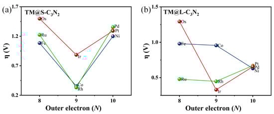 Initially, we focus on TM@S-C3N2 systems in which group VIII atoms are doped into the small cavity. Specifically, we can find from Figure 7a that, when Fe, Ru and Os atoms doped in the small hole are used as adsorption sites (TM@S-C3N2), they can be located on the left side of the volcano curve, indicating that there is a strong interaction between O* and these TM atoms with eight outer electrons. In contrast, when the doped Ni, Pd and Pt atoms with ten outer electrons act as adsorption centers, they can be situated at the right side of the volcano curve, suggesting a weak interaction between O* and these TM sites. It is known that in general, the adsorption strength of reaction intermediates (such as O*) is crucial to determine the OER activity of the catalyst. Too strong or too weak adsorption of the intermediates is unfavorable to the occurrence of a catalytic reaction, in view of the fact that the former will block the catalytic site while the latter cannot provide enough driving force to bind adsorbates [42]. Therefore, when doping the Co/Rh/Ir atoms with nine outer electrons in the middle, high OER catalytic activity can be observed, because they can bring the appropriate adsorption strength of O*, which can be reflected by the fact that they are generally at the peak of the volcano curve.
