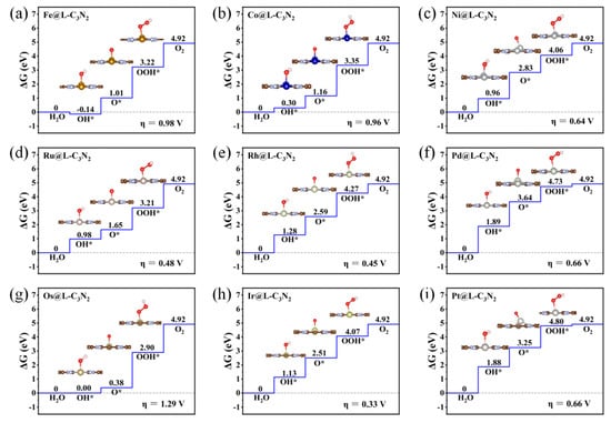 Gibbs free energy diagram of OER for TM@L-C3N2 series including Fe@L-C3N2 (a), Co@L-C3N2 (b), Ni@L-C3N2 (c), Ru@L-C3N2 (d), Rh@L-C3N2 (e), Pd@L-C3N2 (f), Os@L-C3N2 (g), Ir@L-C3N2 (h) and Pt@L-C3N2 (i).