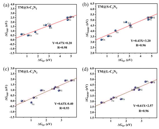 The scaling relationships corresponding to ∆GO* vs. ∆GOOH* and ∆GO* vs. ∆GOH* for TM@S-C3N2 (a,b) and TM@L-C3N2 (c,d).