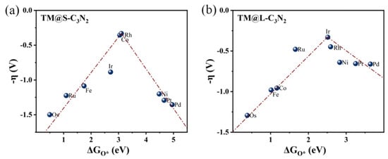 Volcano plots of -η vs. ∆GO* for (a) TM@S-C3N2 and (b) TM@L-C3N2.