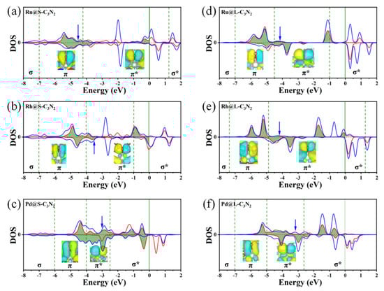 Partial density of states (PDOS) of the p orbitals of O atoms and the d orbitals of TM atoms after the O* adsorption of Ru@S-C3N2 (a), Rh@S-C3N2 (b), Pd@S-C3N2 (c), Ru@L-C3N2 (d), Rh@L-C3N2 (e) and Pd@L-C3N2 (f). Inset: the molecular orbitals of O atom adsorbed at the TM-site in different energy ranges marked by green dashed lines. Blue arrow represents the p–d overlap center.