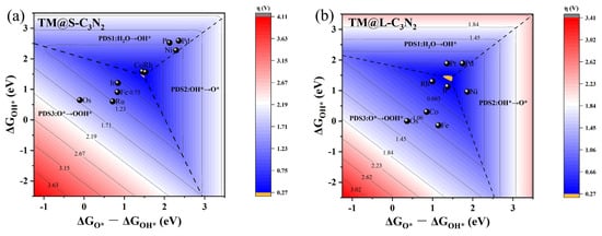 The 2D colored contour plots of OER activity volcanos for (a) TM@S−C3N2 and (b) TM@L−C3N2 by presenting the η values as a function of the Gibbs free energies.