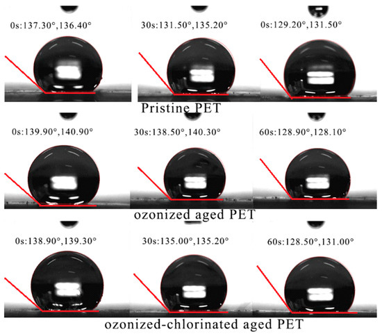 The SEM images (Figure 1) display that pristine and oxidized PET surface structures differ. There were obvious pores and layered structures on the surface of pristine PET, which facilitated the adsorption of organics. Compared with pristine PET, oxidized PETs had more obvious rough surfaces with debris and cracks. Fragmentation suggested the breakage of PET backbones leading to the formation of side chains, oxygenated functional groups, and the release of additives inside PETs. The increase in pore structure directly affected the specific surface area and provided more sites for the adsorption of pollutants. It was reported [30,31] that cracks appearing on the surface of glassy polymer PET after aging have enhanced the surface permeability and decreased the contact angle. From the dynamic contact angle analysis in Figure 2, the left contact angle of different treated PETs after 60 s was in the order of pristine PET(137°) > ozonized PET (128.90°) > ozonized-chlorinated PET (128.50°). The degree of the left contact angle reduced as the time of the oxidation process increased.