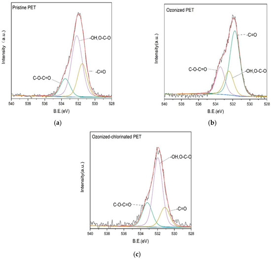 The result of XPS of (a) pristine PET, (b) ozonized PET and (c) ozonized−chlorinated PET before adsorption.