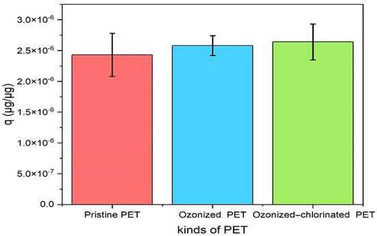 The pristine and oxidized PET had various performances when the pH changed from 4 to 7. As an important property in the aquatic environment, pH can change the surface charge of MPs to affect the adsorption capacity of MPs [37]. It has been proved that the outer surface of PET has a nucleophilic nature [38]. Moreover, TBM hydrolyzed in water, which is the process of nucleophilic substitution [39] leading to TBM with a positive charge. Hence, the adsorption mechanism between PET and TBM might include electrostatic interaction. The influence of pH on the adsorption of TBM on pristine PET, ozonized PET, and ozonized-chlorinated PET is shown in Figure 9a. We found that the adsorption capacity came to the highest no matter which type of PET (qpristine PET =2.09 × 10−6 μg/μg, qozonized PET =1.52 × 10−6 μg/μg, qozonized-chlorinated PET = 2.67 × 10−6 μg/μg) when pH 4 indicating that low pH was more conducive to the adsorption of TBM on PET through hydrophobic effect [29]. Pristine PET, ozonized PET, and ozonized-chlorinated PET had the lowest adsorption capacity (qpristine PET = 9.34 × 10−8 μg/μg, qozonized PET =7.28 × 10−7 μg/μg, qozonized-chlorinated PET = 1.05 × 10−6 μg/μg) at pH = 6, 5, and 7, respectively, indicating that oxidation changed the surface charge density which is related to the zero point of charge of PET. When the pH of the aqueous solution was lower than the zero point of charge of PET, the adsorption capacity of PET reached the lowest because the charge of the PET surface turned out to be positive, consequently, the repulsion between PET and TBM reached the highest [40].