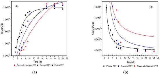 Kinetics model of TBM adsorption by pristine PET, ozonized PET, and ozonized−chlorinated PET. (a) Pseudo−first−order model, (b) pseudo−second−order model.