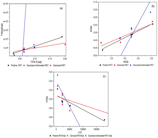 Sorption isotherms of TBM on pristine PET, ozonized PET, and ozonized−chlorinated PET: (a) Langmuir model, (b) Freundlich model, (c) D−R model.
