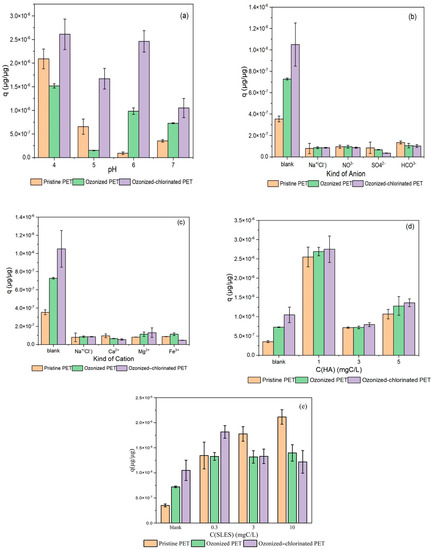 SLES used in this study did not reach its critical micelle concentration (CMC) within the range of concentrations tested so that micelle did not form and SLES was free and evenly distributed in solution as molecules. As shown in Figure 9e, SLES as an anionic surfactant promoted the adsorption of TBM on pristine and oxidized PET. For pristine PET, with the concentration of SLES at 0.3 mg/L, 3 mg/L, and 10 mg/L, the adsorption of TBM rose by 281.3%, 402.8%, and 498.9%. For ozonized PET, the adsorption of TBM rose by 1726%, 1713%, and 1465.9%. As for ozonized-chlorinated PET, the adsorption of TBM rose by 73.3%, 26.7%, and 16.2%. It solubilized a certain amount of TMB hence promoting the TBM adsorption on all tested PET. SLES adsorbed on the surface of PET as monolayers through hydrophobic interaction, and the hydrophilic group was oriented towards the solution. Due to the negative charge of the hydrophilic end of SLES, TBM could be adsorbed by electrostatic attraction [44]. Therefore, the adsorption capacity of pristine PET increased. For ozonized PET, the above effects are greatly enhanced due to surface fragmentation and the increase of specific surface area after ozone oxidation. For ozonized-chlorinated PET, this promotion effect was not obvious. One reason is that the adsorption mechanism of TBM by ozonized-chlorinated PET was mainly pore filling. On the other hand, ozonized-chlorinated PET had the strongest hydrophilicity. The presence of halogen bonds changed the charge distribution and strengthen its anion effect, and electrostatic repulsion occurred between SLES and part of the ozonized-chlorinated PET surface.