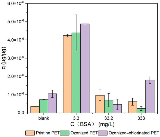 The effect of the presence of BSA on the adsorption of PET toward TBM was shown in Figure 10. At different concentrations of BSA—at 3.3 mg/L, 33.2 mg/L, and 333 mg/L—the adsorption of TBM on pristine PET was promoted by 1097.7%, 173.40%, and 74%, respectively. For ozonized PET, when the concentration of PET was at 3.3 mg/L, the adsorption of TBM was promoted by 501.6%, but for concentrations at 33.2 mg/L and 333mg/L, the adsorption of TBM was reduced by 3.71% and 65.9%, respectively. For ozonized-chlorinated PET, when the concentration of BSA was at 3.3 mg/L and 333mg/L, the adsorption of TBM was promoted by 74% and 71.4%, respectively, but for the BSA concentration at 33.2 mg/L, the adsorption of TBM was reduced 65.9%. It can be seen that the addition of low-concentration BSA (3 mg/L) greatly promoted the adsorption of TBM by three PETs. When BSA was combined with pristine PET, the hydrophilicity of pristine PET was strengthened. The polar ends of BSA, such as amino acid residues, exposed and interacted with TBM by electrostatic adsorption [45]. However, when the hydrophilicity was enhanced after PET oxidation, this promoting effect attenuated. When the concentration of BSA increases, the globular structure of BSA can cause steric repulsion between particles. In addition, BSA also competes with TBM for effective adsorption sites. Therefore, with the increasing amount of BSA, the promoting effect on the adsorption of TBM changes from not obvious to inhibition. It should be noted that the adsorption of TBA on ozonized-chlorinated PET increased by 71.4% when the concentration of BSA was at 333 mg/L. Halogen bonds brought greater electronegativity to the surface of ozonized-chlorinated PET and increased the adsorption of TBM. On the other hand, it is also reported that the presence of Cl ions changes the configuration and the local charge of BSA [46,47].