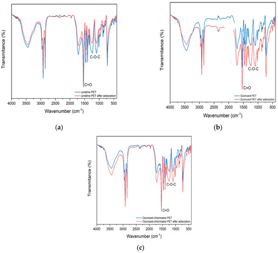 The FT−IR spectra of the PET with different treatments before and after absorption (a) pristine PET, (b) ozonized aged PET, (c) ozonized−chlorinated aged PET.
