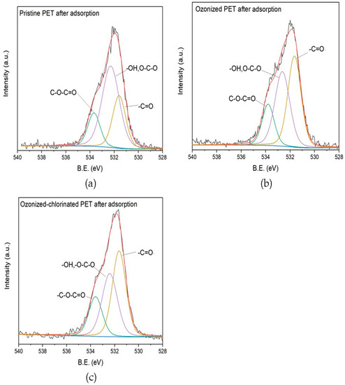 The comparison of FTIR spectra between various treated PET before and after adsorption is shown in Figure 11. It illustrates that no new functional group peak appeared after adsorption, which indicates that no chemical bonding formation occurred during the adsorption process. It can be concluded that the adsorption between various treated PETs and TBM is not predominant chemical adsorption. After the adsorption of TBM onto pristine PET, the stretching vibration of the hydroxyl group located in 3435 cm−1 decreased indicating the formation of hydrogen bonds which were converted from hydroxyl groups. Therefore, hydrogen bonding between TBM and pristine PET is involved in the adsorption process. FTIR spectra of oxidized PETs after adsorption shows several discernible changes. After TBM adsorption, the strength of the main functional groups is enhanced, e.g., the peak of the C=O groups, C-O-C groups, and C-O bonds of ester groups. The content of surface hydroxyl groups increased owing to the increased surface wetness. Infrared absorption peaks of oxygenated function groups on the oxidized PET shifted towards lower frequencies due to the increased polarity of carbonyl groups. For a better understanding of the role of oxygen-containing groups in the adsorption process, we investigated the XPS O1S of three PETs after adsorption as presented in Figure 12. The content of oxygenated groups of the pristine PET before and after the adsorption of TBM had no significant difference, demonstrating the main adsorption mechanism between TBM and pristine PET was hydrophobic interactions and hydrogen bonding between molecules. Oxidation and subsequent release of plastic additives from cracks resulted in an increased number of oxygenated groups [48], which caused the reinforcement of electrostatic interactions on the oxidized PET surface. Revealed by XPS spectra, the peak at 531 eV corresponding to the carbonyl groups of the ozonized PET was decreased, which is ascribed to the nucleophilic reactions between hydrolyzed TBM and ozonized PET surface. It is noted that the amount of carbonyl group of ozonized-chlorinated PET increased indicating its adsorption mechanism was dissimilar to ozonized PET. The main adsorption active sites were not the oxygenated functional groups but the intermolecular halogen bonds. Pore filling, electrostatic interactions caused by halogen bonds, and hydrophobic partitioning were the main adsorption mechanisms for ozonized-chlorinated PET.