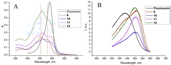 Absorption (A) and emission spectra of fluorescein (in 0.1 NaOH) and its derivatives 6, 10 –12 in water (1% DMF), C = 8.75 µM (for fluoresceine emission C = 2 µM).