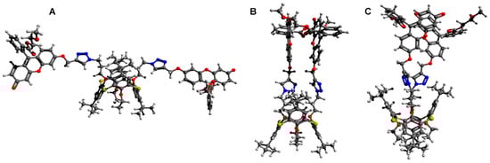 The introduction of florescein fragments into the macrocyclic platform leads to a bathochromic shift of bands at 455 and 480 nm, which is more pronounced in the case of di-substituted macrocycles 10 and 11 (∆λ is 9 nm) and less pronounced in the case of tetra-substituted macrocycle 12 (∆λ is 4 nm). An analysis of the fluorescence spectra (Figure 1B) in this case shows that the emission maximum at 514 nm upon the introduction of fluorescein fragments into the macrocycle, on the contrary, shifts hypochromically (∆λ is 9 nm). Correspondingly, the Stokes shift for calixarene derivatives becomes smaller, which is also characteristic of J-aggregates []. Taking into account that the observed shifts do not depend on the concentration, the formation of intramolecular J-aggregates is most probable. Quantum-chemical calculations were carried out to check the probability of formation of intra/intermolecular aggregates. Due to the size of the molecule, quantum-chemical calculations were done in the Priroda 19 package, which has one of the best scalabilities in time/system size. The difference in the Gibbs energy between the intramolecularly stacked (Figure 2B,C) and the open conformer form of calixarene (Figure 2A) is ~9 kcal/mol. Thus, the stacked form is the dominant conformer form in the gas phase and is highly probable in water.