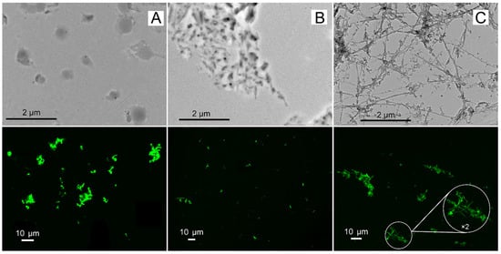 The morphology of aggregates formed by macrocycles was also established using transmission electron microscopy (TEM) and confocal microscopy (Figure 3). According to the obtained microphotographs, macrocycle 10 forms large submicron aggregates up to 900 nm in size. These aggregates are clearly visible on a confocal microscope due to their intense fluorescence. Macrocycle 11, on the contrary, forms nanoparticles with sizes of 100–150 nm. An interesting morphology was recorded in the case of compound 12. The formation of worm/rod-like structures is observed, which, due to their emission, are also clearly visible on a confocal microscope.