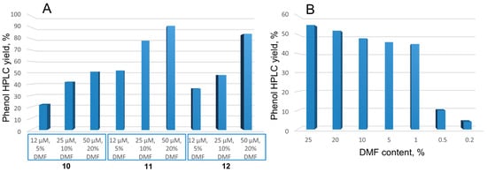 HPLC-UV was used for quantitative control of the reaction using calibration curve constructed from known amounts of phenol. The reaction was carried out in a water–DMF mixture (total volume 0.5 mL) in the presence of various amounts of a catalyst. According to the data obtained (Figure 4A), with an increase in the amounts of both catalyst and DMF, the yield of phenol increases. The best results in all cases were demonstrated by macrocycle 11 with tetradecyl fragments. Thus, at a DMF content of 20% and a catalyst content of 50 µmol (0.5 mol % with respect to phenylboronic acid), it was possible to achieve 91% phenol content in the reaction mixture.