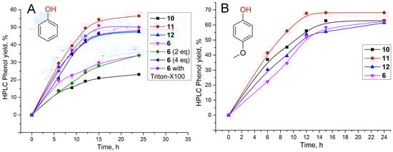HPLC yield of phenol (A) or 4-methoxyphenol (B) from photoredox ipso oxidative hydroxylation of phenylboronic/4-methoxyphenyl boronic acid using 6 and 10–12 vs. time of irradiation (White LED, 34 W), 1% DMF content. C (PhB(OH2)) or (CH3C6H4B(OH2)) = 10 mM, C (NEt3) = 20 mM, C (6, 10–12) = 12 μM, C (Triton X-100 = 0.3 mM).
