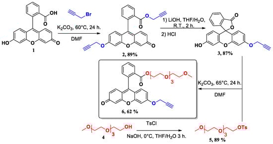 The structure of fluorescein 6 was well-proven using NMR 1H, 13C, IR and high-resolution ESI (HRESI) mass spectrometry (See Supplementary Materials Figure S1). On the 1H NMR spectrum, xanthene aromatic skeleton peaks are observed as a doublet of doublets at 8.28 ppm, 7.29 ppm, 6.79 ppm, 6.53 ppm; a doublet of triplets at 7.73 and 7.67 ppm; and as doublets at 7.06 ppm, 6.91 ppm and 6.86 ppm. The protons of the propargyl group appear as a doublet at 4.80 ppm and a triplet at 2.64 ppm. The ethylene protons of the methyltetraethylene glycol appear as a multiplet at 4.14 ppm, a singlet at 3.62 ppm and a set of triplets at 3.53, 3.45 and 3.40 ppm; methyl protons appear as a singlet at 3.36 ppm (See Supplementary Materials Figure S1a). According to the HRESI MS data, there is the presence of [M+H]+ ion (m/z calculated for [C32H33O9]+ 561.2119, found: 561.2112).