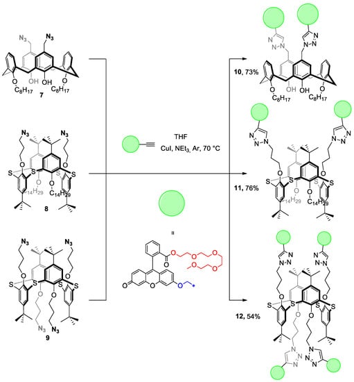 The next step was the reaction of calix[4]arenes 7–9 containing different numbers of azide groups with the resulting fluorescein derivative 6 (Scheme 2). For the reaction, fluorescein 6 was used at the rate of 1 equivalent per 1 azide group of the macrocycle. Refluxing in THF in the presence of copper iodide turned out to be the most optimal for carrying out the CuAAC reaction. After 12–48 h compounds 10–12 were isolated as orange solids with yields from moderate to excellent. Compounds 11 and 12 were additionally purified using column chromatography.