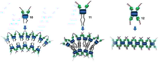Thus, the formation of aggregates can be schematically depicted as follows in Scheme 3. Compounds 10 and 11 form vesicle-like aggregates []. Compound 11 forms more compact aggregates, which is explained by more efficient hydrophobic interactions between long tetradecyl fragments. Compound 12 forms extended structures, the formation of which can involve both hydrophobic interactions of the calixarene backbone and π-π stacking interactions between electron-rich fluorescein residues.