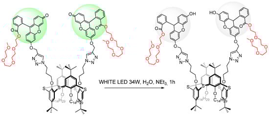 Considering that compound 11 contains sulfur atoms, which can also undergo photooxidation to the corresponding sulfoxides and sulfones in the presence of electron-donating additives [], an additional experiment on photoirradiation of compound 11 itself in the absence of a substrate (phenylboronic acid) to show the stability of the thiacalix[4]arene platform itself was carried out. For precise control, an HPLC-MS chromatogram of the 11 solution was taken before and after LED irradiation, which was carried out for 1 h (See Supplementary Materials Figure S10). According to the data obtained, we found HRESI MS signals corresponding to the addition of two hydrogen molecules to the macrocycle in the form of double charged cation [M+2H2+2H]2+ with m/z = 1203.1185 (calculated for C138H184N6O22S42+ = 1203.1184) and two sets of signals related to double charged cations [M+2H2+Na+H]2+ with m/z = 1214.1090 (calculated for C138H183NaN6O22S42+ = 1214.1094) and [M+2H2+2Na]2+ with m/z = 1225.0995 (calculated for C138H184N6O22S42+ = 1225.1004) were detected in the high-resolution spectrum. Therefore, in the absence of a substrate, photocatalyst 11 underwent photoredox reduction of fluorescein fragments to a colorless leuco form (Scheme 5).