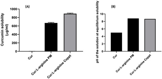The solubilities of curcumin alone and in curcumin-L-arginine PM and Coppt mixtures are shown in Figure 2A. The pH of the tested solutions at equilibrium (started solubility) was measured, and the results are shown in Figure 2B.