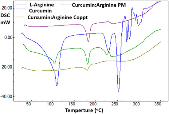 The DSC thermal traces recorded for curcumin, L-arginine, and curcumin–L-arginine physical and coprecipitated mixtures are shown in Figure 3. A sharp endothermic peak was recorded for curcumin at 183 °C. This thermal event was due to the melting of curcumin [18,19]. Two thermal events were reported for L-arginine at 109 °C and 252 °C due to the loss of bound water and arginine melting, respectively [20].