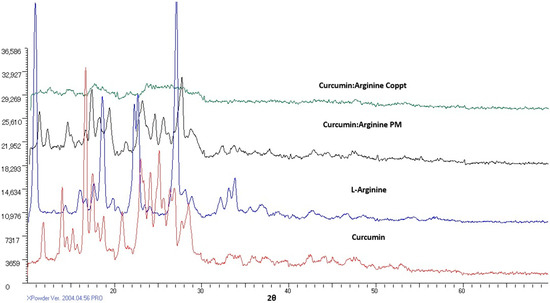 The crystallinity of curcumin, L-arginine, and curcumin–L-arginine complex/salt was studied using an XRD diffractometer (Unisantis XMD-300, GmbH, Osnabruck, Germany). The tube operated at 45,000 V and 0.8 mA. The scan range was 5–60° of a 2θ diffraction angle.