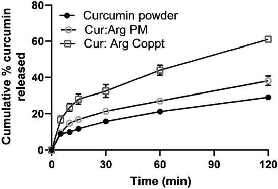 Slow drug dissolution of up to 30% over 2 h was recorded for curcumin powder. Curcumin–L-arginine PM showed a slight improvement in the dissolution of curcumin; up to 40% of curcumin was dissolved in 2 h. On the other hand, a marked enhancement of curcumin dissolution was recorded in up to 60% of drug releases. This two-fold enhancement of dissolution rates recorded for curcumin and L-arginine Coppt could be attributed to the salt formation and alkalinization of the diffusion layer surrounding curcumin particles and the increased ionization of curcumin and its solubility in the stagnant diffusion layers [13].