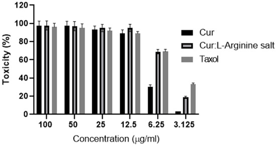 Six consecutive concentrations (3.125, 6.25, 12.5, 25, 50, and 100 µg/mL) of curcumin alone and curcumin, L-arginine, Coppt, and taxol were investigated for cytotoxicity on MCF-7 human breast epithelial cell lines. The results of the toxicity study on MCF-7 human breast epithelial cell lines are shown in Figure 7. Marked cell death (70–100%) was recorded in concentrations ranging from 25 to 100 µg/mL for all tested samples (Figure 7). However, the other lower concentrations (6.250 and 3.125 µg/mL) showed a significant reduction in cytotoxicity percentage for curcumin, L-arginine, and Coppt compared to curcumin alone. This was evident from the estimated IC50% for the standard anticancer drug taxol, curcumin and L-lysine salt, and curcumin alone (4.85 ± 0.05, 5.64 ± 0.08, and 7.83 ± 0.03 µg/mL, respectively). These findings can be explained by the fact that L-arginine increased curcumin’s permeability and cell uptake by forming an ion-pair complex. Additionally, other research has suggested that curcumin and L-arginine salts can be transported on surface-decorated L-arginine receptors in cancer cells [9,11]. For example, the basic amino acid lysine enhanced the solubility of insulin in water; further, the permeability of insulin-L-lysine ion pair complex was significantly enhanced through buccal cell layers [11]. Additionally, curcumin–polyethylene glycols soluble complex has been reported to enhance the anticancer potential against colorectal adenocarcinoma [23].
