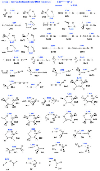 In the following, general trends found for Group I–Group VI members are discussed referring to the data collected in Figure 2, Figure 3, Figure 4, Figure 5, Figure 6, Figure 7, Figure 8 and Figure 9 and Table 1, Table 2 and Table 3. In addition, bond lengths R in Å, local mode force constants in mdyn/Å, local mode vibrational frequencies in cm, binding energies E in kcal/mol, electron densities at the bond critical points in e/Å and energy densities at bond critical points in Hartree/Å of protonic and hydridic parts of DHBs and DHBs for all complexes and references compounds are compiled in Table S2 of the Supplementary Materials.