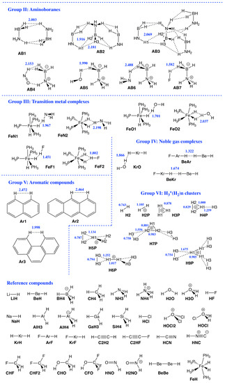 Therefore, the focus of our study was to introduce a quantitative bond strength measure based on the local vibrational mode analysis (LMA), originally developed by Konkoli and Cremer [53,54,55,56,57], paired with Weinhold’s Natural Bond Orbital (NBO) population analysis [58,59,60], and Bader’s Quantum Theory of Atoms–In–Molecules (QTAIM) analysis [61,62,63,64], in order to obtain a deeper understanding of DHBs in general, in particular their strength, and to unravel similarities/differences compared to conventional HBs. Figure 1 shows the set of DHB complexes investigated in this study (organized in six specific groups) covering a broad spectrum of DHBs, ranging from weak interactions of electrostatic origin to strong interactions with covalent character. Group I includes hydrides interacting with simple organic neutral and cationic molecules as well intramolecular DHB in boron complexes, and Group II shows DHB in ammonia–borane complexes. DHB in Fe complexes are included in Group III, while DHB in noble gas complexes are involved in Group IV. We also reassessed the H−H interaction in aromatic hydrocarbons such as phenanthrene, dibenz[a]anthracene, and biphenyl [22,65] in Group V, where both hydrogen atoms are equally charged, which has been called the H−H bond in the literature, to contrast this situation from DHB [11], leading to some controversy [66]. Group VI of our study is made up of DHB in H3+(H) hydrogen clusters.