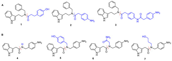 (A) Structures of the acyl N-benzyl tryptamine amides 1–3, prepared according to path A, and (B) of the indolyl acetic acid amides 4–7 obtained via path B. The variable groups are rendered in blu.
