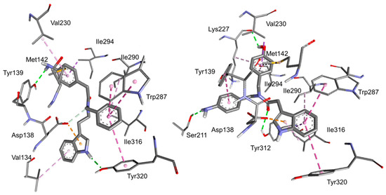 The side views of the best-scoring poses are shown in Figure 3; for alterative top views of the predicted binding poses see also Figure S8 (Supplementary Materials).