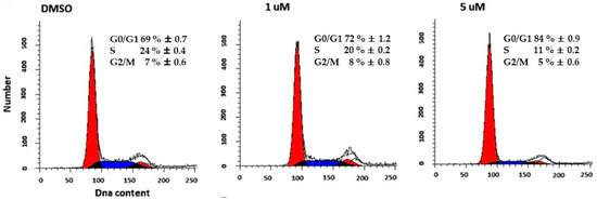 HT29 cells were treated with 1 or 5 μM 5 for 24 h and analyzed by flow cytometry after DNA staining. The results showed that untreated cells progress through the cell cycle. In contrast, 5-treated HT29 cells accumulated in the G0/G1 phase in a dose-dependent manner, with a nearly complete synchronization (84% ± 0.9) after 5 μM treatment. The flow cytometric analyses, along with the relative phase percentages, are shown in Figure 4.