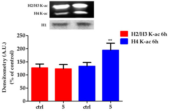 HT29 cells were seeded in dish and after 24 h they were treated for 6 h with compound 5 at final concentration of 5 µM. Cells were harvested, washed with 10 mM sodium butyrate in PBS, and nuclei were isolated in according to Amellem and Micheletti [50,51]. The nuclear pellet was suspended in 0.1 mL ice-cold H2O using a Vortex mixer, and concentrated H2SO4 was added to the suspension to give a final concentration of 0.4 N. After incubation at 4 °C for 1 h, the suspension was centrifuged for 5 min at 14,000× g, and the supernatant was taken and mixed with 1 mL of acetone. After overnight incubation, the coagulate material was collected by microcentrifugation and air-dried. This acid soluble histone fraction was dissolved in 20 μL of H2O. Proteins were quantified using a protein assay kit (Bio-Rad, Hercules, CA, USA). Histones were detected resolving samples on a 10% gel in MES buffer at 200 V for 40 min. Western Blot was performed in transfer buffer at 100 V for 1 h. The nitrocellulose membrane was incubated with primary antibody specific for anti-acetylated lysines (Millipore, Billerica, MA, USA) for 1 h. After five washes with PBS-TWEEN 20 0.1%, the membrane was incubated as before with secondary HRP-conjugated antibody (GE Healthcare, Milan, Italy). After five washes with PBS-TWEEN 20 0.1%, antibody binding was detected by Amersham ECL Plus Western Blotting Detection System (GE Healthcare, Milan, Italy).