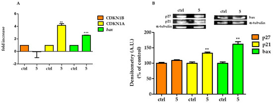 To verify whether the epigenetic modifications were related to changes in gene expression, we proceeded with the qtRT-PCR analysis and western blot of related protein products. Transcription levels of CDKN1B, CDKN1A, and Bax were analysed by RT-PCR performed on cDNA of HT29 control and treated with 5 μM of 5 for 6 h. Genes transcription was normalized to the reference gene G3PDH and the relative variations (fold change) are reported in Figure 6A. CDKN1A and Bax genes expression were significantly upregulated by 5 by a factor of 4.16 ± 0.53 (p ≤ 0.0001 vs. control), and 2.58 ± 0.11 (p ≤ 0.0001 vs. control), respectively; on the other hand, 5 did not modify the gene expression of CDKN1B.