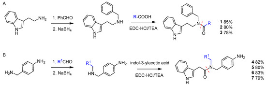 Path (A), synthesis of the indole amides 1–3 derived from tryptamine; path (B), synthesis of 4–7 obtained from indol-3-ylacetic acid.