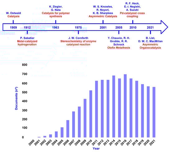 Historical timeline of the Nobel Prize in Chemistry devoted to catalysis (upper part) and the number of articles containing “organocatalysis” or “organocatalytic” in the title, abstract, or keywords per year (Scopus search, October 2022). Reviews, book chapters, editorials, and conference papers are not included (bottom part).