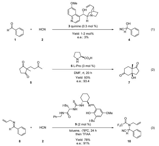 However, the reports by MacMillan and List were not the first examples of organocatalytic reactions that appeared in the literature; indeed, several reactions that fulfill the given definition for organocatalysis were reported years before, even if they appeared as isolated examples without a general conceptualization. For example, the first report about the use of a small organic molecule to asymmetrically catalyze an organic transformation was back in 1912, when Bredig and Fiske showed that chiral cinchona alkaloids (3) may catalyze the addition of hydrogen cyanide (2) to benzaldehydes (1) to obtain cyanohydrines (4), although in low enantiomeric excess (Figure 2(1)) []. Another pivotal study was reported in 1971 when Hajos and Parrish recognized that L-proline (6) catalyzed the intramolecular cyclization of ketotrione 5 to furnish the Wieland–Miescher ketone 7 in high yield and enantiomeric excess (e.e.) (Figure 2(2)) [,]. More recently, in 1998 Jacobsen and coworkers first reported that a thiourea-based catalyst (9) acts using hydrogen-bonding to catalyze an asymmetric Strecker reaction, leading to the adduct 10 in high yield and high e.e. (Figure 2(3)) [].