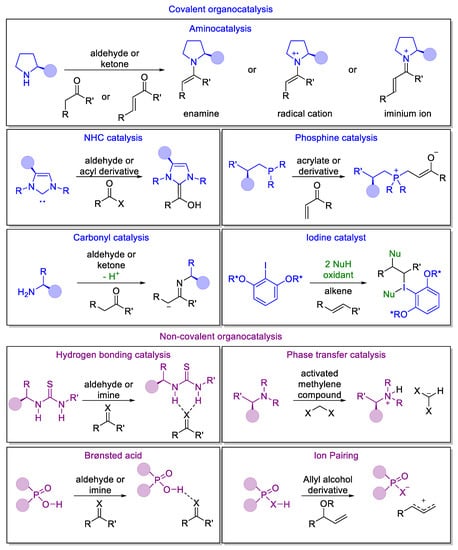 Main organocatalytic activation modes: In covalent activation, the most used activation mechanism, relying on aminocatalysis (enamine, single-occupied molecular orbital (SOMO), and iminium ion catalysis), NHC, phosphine catalysis, carbonyl catalysis, and iodine catalysis. In noncovalent activation, the main activation modes are based on hydrogen-bond, phase-transfer, Brønsted acid, and ion-pairing catalysis.