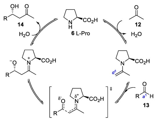 The corresponding catalytic enantioselective, intermolecular aldol reaction, that is, the nucleophilic addition of a ketone (acetone, 12) to differently substituted aldehydes (13), was presented in 2000, marking the initial point for asymmetric organocatalysis []. Similar to the Stork reaction in which an enamine is used stoichiometrically, the accepted catalytic cycle starts with the condensation of the ketone 12 with the catalyst, the secondary amine L-Proline (6), to form the corresponding enamine (Figure 5). This acts as a d1 nucleophile reacting with an aldehyde (13) (a1 electrophile), thus generating the desired aldol product (14) after hydrolysis, which liberates the amino acid that enters in a new catalytic cycle.