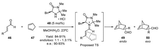 Soon after the publications of List, Lerner, and Barbas III re-discovering enamine catalysis, MacMillan and coworkers reported the discovery of iminium-ion catalysis that used the secondary amine 48 as a Diels–Alder-mediated catalyst for performing the aforementioned cycloaddition, in this case between an α,β-unsaturated aldehyde (46) and a diene (47) []. This discovery introduced the “iminium-ion” concept as a general activation mode in asymmetric synthesis (Figure 9). In this reaction, an unsaturated iminium-ion is the catalytically generated dienophile. The structure of the catalyst controls the approach of the diene from the less hindered face, which results in almost complete control of the enantioselectivity in the formed adduct.