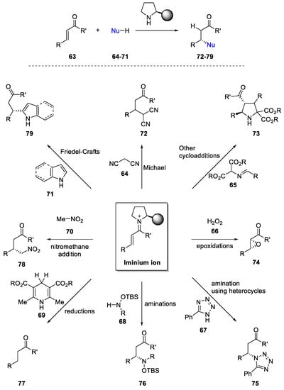 Together with Diels–Alder reactions and the other cycloadditions mentioned before, the iminium-activation protocol has been extensively developed over the last two decades []. In fact, the iminium ion generated in these processes can be used as a simple electrophile at β-position instead of a dienophile for reacting with different nucleophiles (64–71). Therefore, over α,β-unsaturated ketones and aldehyde 63 addition of activated methylene compounds, azomethine ylides, epoxidation, aza-Michael additions, reductions, Michael additions, Friedel–Crafts, and other conjugate additions have been developed with success (Figure 13).