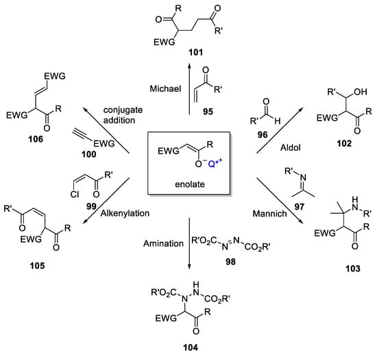 Following a similar mechanism, different reactions have been presented during the last decades. In fact, the most significant advances in this type of catalysis are due to the use of the different electrophiles (95–100) in the original reaction as well as the use of various active methylene compounds. Thus, Michael acceptors, aldehydes, imines, azoderivatives, or haloalkenes have been used with success for alkylating the corresponding enolates (Figure 17).