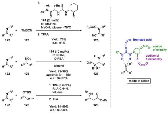 In contrast to covalent organocatalysis, noncovalent organocatalysis has mainly been developed as H-bond and Brønsted acid catalysis. H-bonds, despite their function as a structural determinant, play a crucial role by inducing the acceleration of a myriad of biochemical reactions. A wide range of enzymes employ this principle to activate a given substrate, including serine proteases, type II aldolases, and others []. Electrophilic activation by chiral small-molecule H-bond donors was discovered in pioneering studies beginning in the mid 1980s, but it emerged as an important paradigm for enantioselective catalysis only after the seminal reports by Jacobsen [] and Corey [] that independently reported an asymmetric Strecker reaction using H-bonding organocatalysts. Mechanistic studies of Jacobsen’s reaction revealed that the catalytic activity can be attributed to the ability of the thiourea to efficiently activate the electrophile (i.e., the imine) for nucleophilic attack by engaging the imine via double H-bonding, while the high enantioselectivity arises from the significant steric effect of the amide portion of the catalyst (Figure 20, right) []. Over the last 20 years, the ability of H-bond donors to catalyze useful organic transformations has allowed the identification of a remarkable number of new enantioselective reactions together with the design of novel catalyst frameworks [,,,,,]. Thioureas and diols have been the most extensively applied H-bonding catalysts. In particular, thiourea-based catalysts have shown the ability to promote highly enantioselective cyanosilation [], Henry [], Mukaiyama–Mannich [], and other reactions, with excellent reaction performance (Figure 20, left).