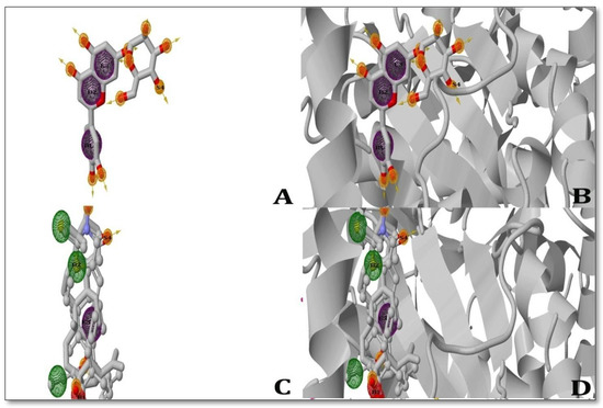 3D depiction of the pharmacophore study used to generate the ligands showing inhibition of the MAP Dephospho-Coenzyme A kinase (DPCK) protein; (A) Solasodine ligand (left); (B) Solasodine pharmacophore (right); (C) Ursolic acid ligand (left), (D) Ursolic acid pharmacophore (right). The interactions between the ligand and the receptor in the study are shown as ball-and-stick models, where green represents pi-cations; blue represents Alkyl bonds; and yellow represents hydrogen interactions. The poor interaction between the ligands and pharmacophore was analyzed by ZINC Pharmer 2022 version.