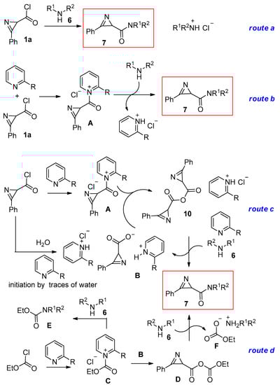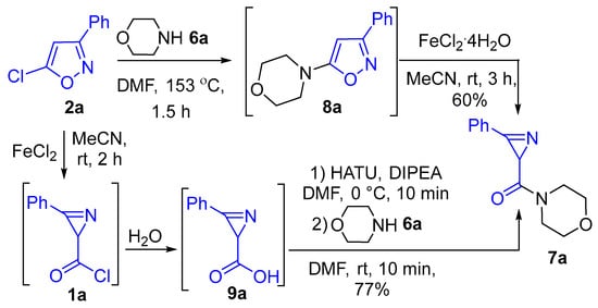 We also tested some other approaches to amide 7a. Thus, heating 5-chloroisoxazole 2a with morpholine 6a to form 5-morpholinoisoxazole 8a, followed by its isomerization catalyzed by Fe(II), gave amide 7a only with an isolated yield of 60% (Scheme 2). Hydrolysis of carbonyl chloride 1a to azirine-2-carboxylic acid 9a, followed by amide coupling using HATU/DIPEA reagents, gave amide 7a in a 77% yield (Scheme 2). These results indicated that using 1 equiv. of morpholine in a reaction with chloride 1a in the presence of 1 equiv. of the ortho-substituted pyridine is the most efficient approach in converting chloroisoxazole 2a to amide 7a.