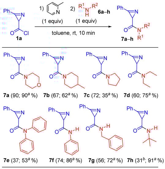 Then, experiments were carried out with various amines, 6a–h, under optimal conditions (entry 3 of Table 2). The use of these reaction conditions allowed for the preparation of amides 7 in higher yields (excluding 7c): 7a (90%), 7b (62%), 7c (35%), 7d (75%), 7e (53%), 7f (86%), 7g (72%), and 7h (91%) (Scheme 3, footnote a). A dramatic increase in yield was significant in the case of tert-butylamine (6h). We noted that the yield of amide 7h was only 42% in the direct reaction of chloride 1a with 2 equiv. of 6h. Importantly, the reaction with aniline gave anilide 7f, which was not available by other approaches [10,11,12,13,14,15,16,17], in an 86% yield.